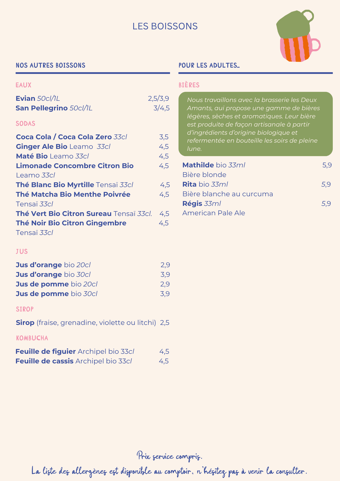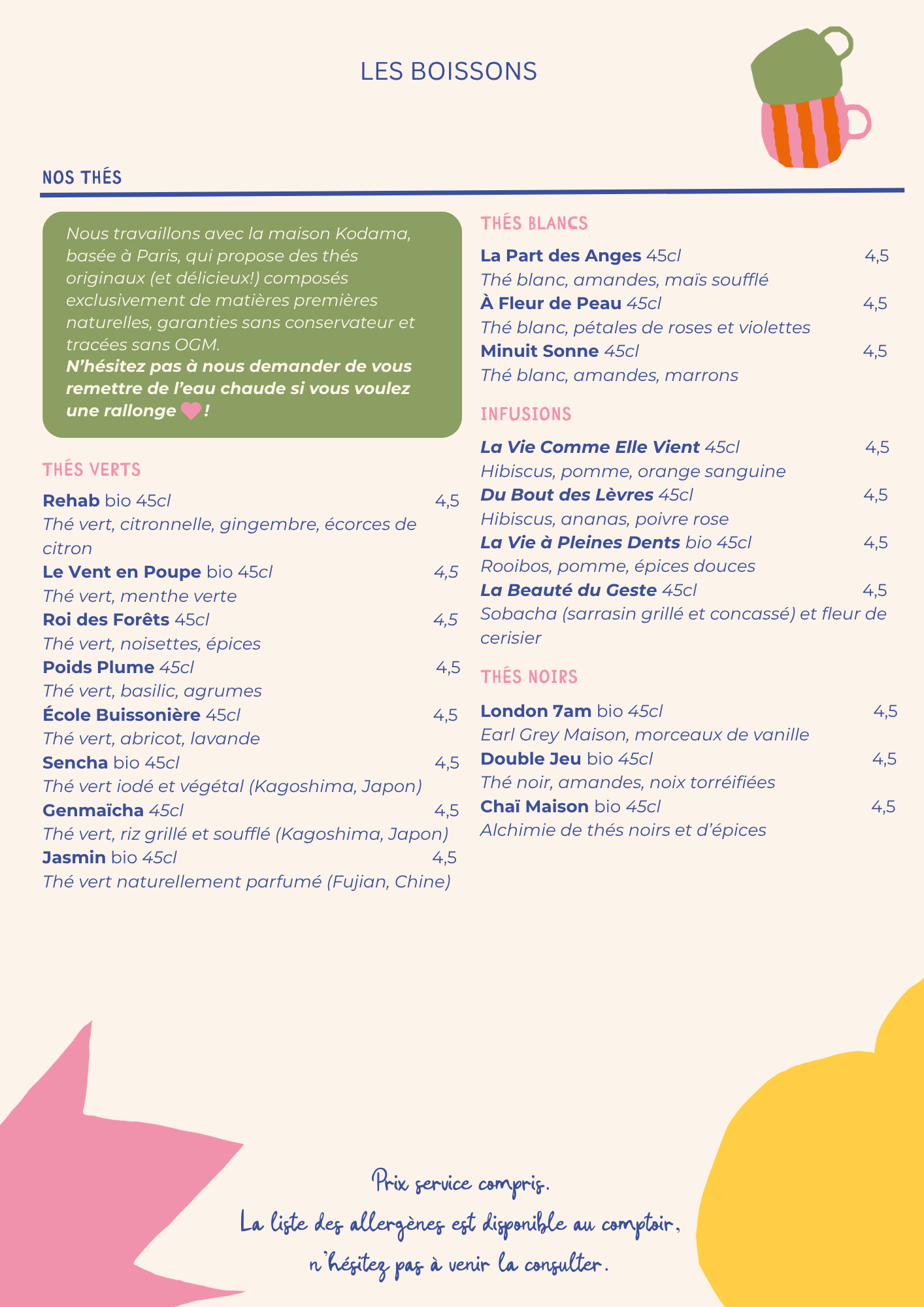 Du petit-déj au goûter, en passan bien sûr par le déjeûner, tout est préparé avec amour, à base de produits frais, de saison, et majoritairement bio.